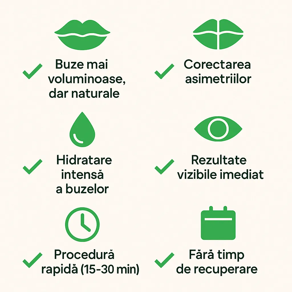Folosim produse premium, certificate la nivel internațional, cu concentrații adaptate zonei buzelor pentru un aspect natural și o hidratare optimă.